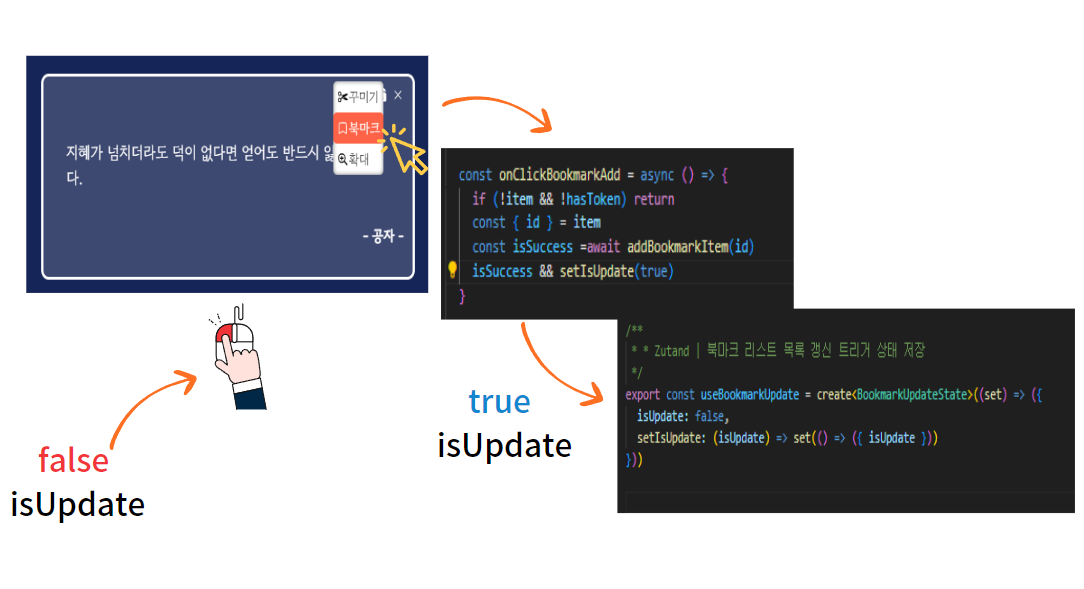setIsUpdate 는 상태를 업데이트하는 setter 이고, isUpdate 는 관리하고자 하는 전역 상태입니다. 해당 값을 boolean 으로 관리하여 향후 북마크 추가 버튼을 클릭하는 순간 이 상태를 true 로 대체하는 방식으로 적용할 예정입니다.