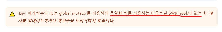 SWR 에서는 동일한 키를 사용하더라도 서로 다른 곳에 위치하는 경우 상태가 공유 되지 않음으로 뮤테이션이 적용되지 않는다고 언급하고 있습니다.