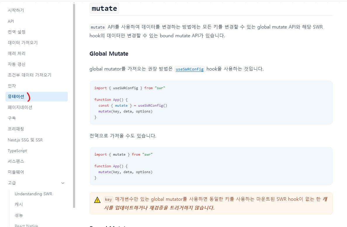 해당 문제를 인지하면서, 제일 먼저 찾아본 것은 SWR 공식 사이트 입니다. TanStack 쿼리에서도 상태 변경을 촉발하는 시점에 값을 업데이트하는 헬퍼 함수가 존재했기에, 이와 유사한 목적을 수행하는 함수가 해당 라이브러리에도 존재할 것이라 판단했기 때문입니다.