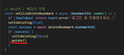 현재 북마크를 조회하는 SWR 훅과 삭제 기능을 수행하는 함수는 동일한 컴포넌트 내에 위치하므로 다음과 같이 적용하였습니다.