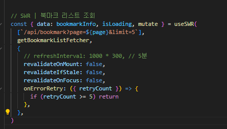 뮤테이션을 적용하게 되면 더 이상 북마크 리스트를 자동으로 갱신하여 가져올 필요가 없기 때문에, refreshInterval 의 옵션을 비활성화하고, 마운트 시(revalidateOnMount) , 캐시 만료 시(revalidateIfStale), 포커스 시(revalidateOnFocus) 데이터가 갱신되지 않도록 관련 옵션을 모두 false 로 지정하였습니다(기본 값은 모두 true 입니다).