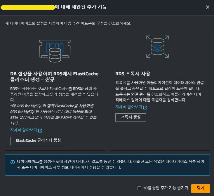 데이터베이스 생성이 끝난 후 뜨는 팝업창 | ElasticCache