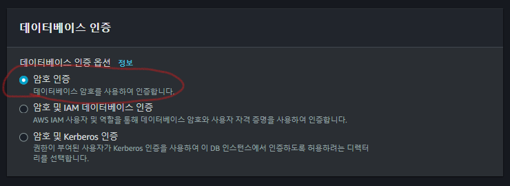 데이터베이스 접속 시 사용하는 암호를 사용하여 인증하도록 설정하였다. 보다 더 복잡하고 보안성을 높이고자 한다면, 이 외 옵션을 선택해도 좋다.