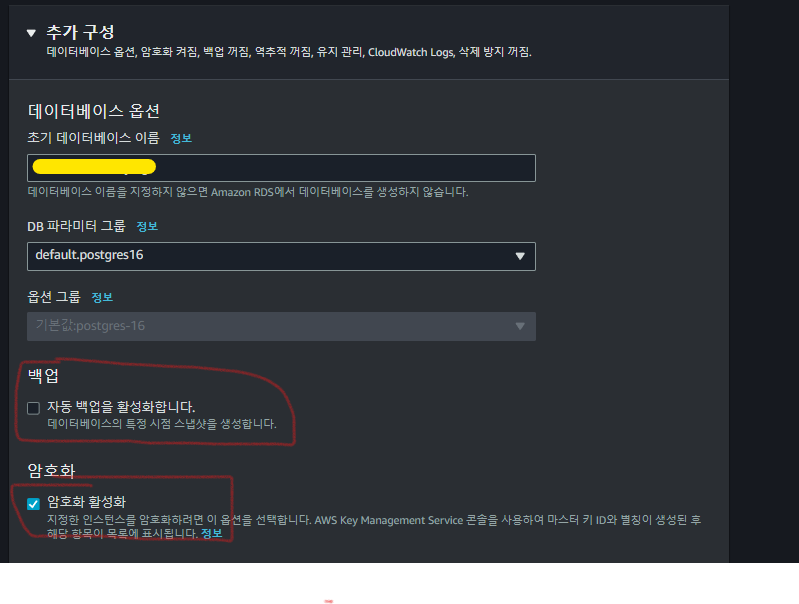 여기서 데이터베이스 생성 초기에 사용한 이름을 설정하고, 자동 백업 활성화의 체크를 해제한다. 자동 백업의 경우 추가 비용이 발생하므로 이를 염두에 두고 필요하다면 활성화 해도 무방하다. 단, 현재 목적은 최소 비용으로 인스턴스를 띄우는 것이므로 이를 사용하지 않는다.