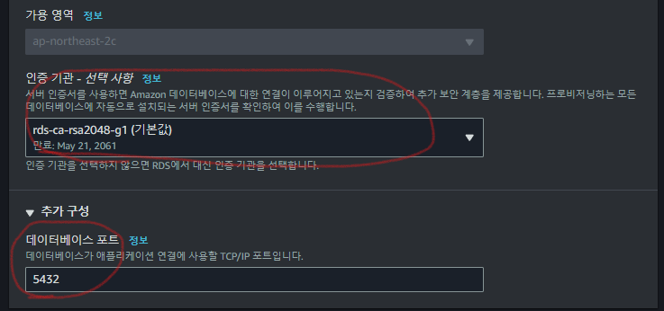 데이터를 저장할 장소를 선택한다. 여기서는 기본값으로 선택하였다. 여기서 고려할 점은 스토리지 자동 조정 기능이다. 현재 스토로지에 할당된 크기가 부족하면 지정한 임계값 만큼 자동으로 늘려주는 기능인데, 해당 기능을 활성화 하면 추가 비용이 발생하므로 이를 염두에 두고 선택하자.