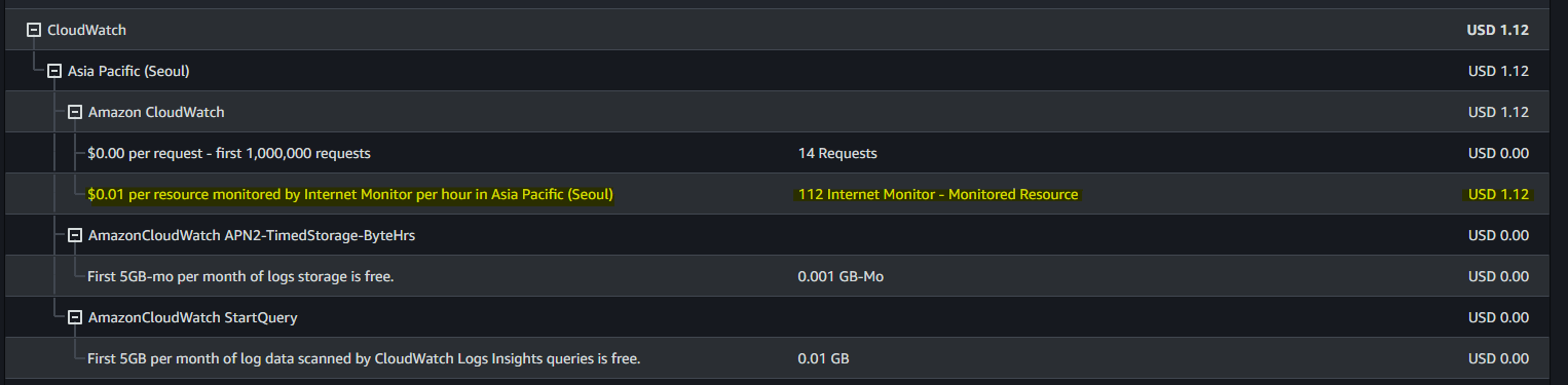 이 부분에 대해서 더 알기 위해 자세하게 찾아보니 인터넷 모니터의 경우에는 초기 100개 까지만 무료로 모니터링을 해주고, 그 이상 초과하는 모니터된 리소스 당 0.01 달러를 시간 당 합산해서 청구하고 있었던 겁니다.
