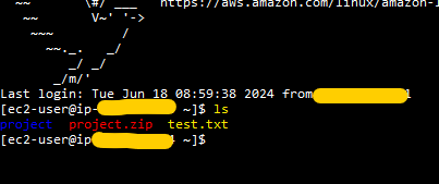 그 후 EC2 인스턴스에서 /home/ec2-user 경로로 접속 후 ls 명령어를 입력해 주면 해당 경로에 test.txt 파일이 정상적으로 있다면 성공입니다.