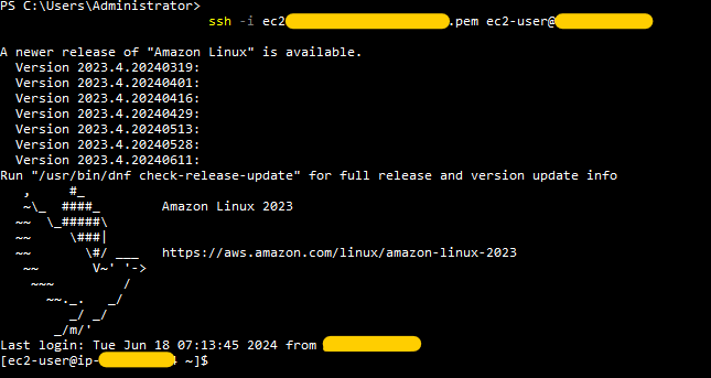 ssh -i [파일이름].pem ec2-user@[ec2의 Public IP 주소 혹은 탄력적 IP 주소]