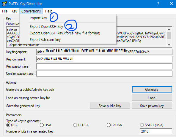 import key 로 .ppk 파일을 가져온 뒤 Export OpenSSH key 를 클릭하여 .ppm 키로 변환 해주는 겁니다.