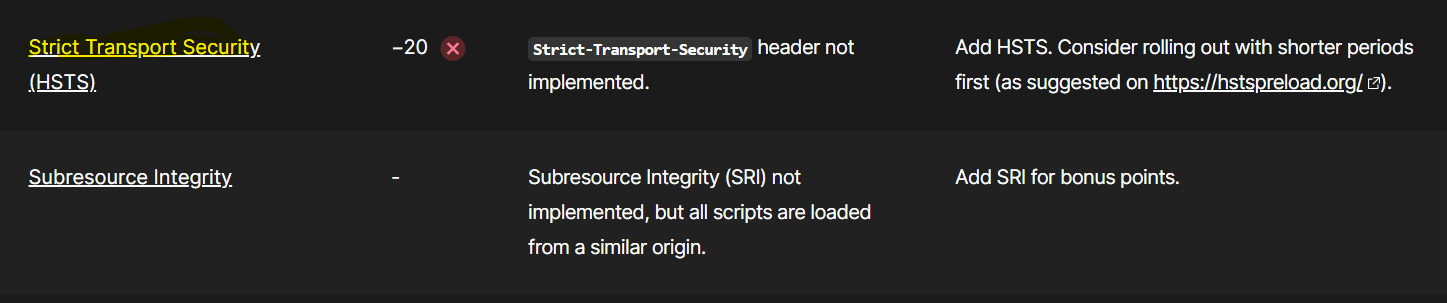 그 다음으로 -20 점을 가져간 친구는 HSTS 라고 합니다. STS 헤더를 구현하지 않았으니 추가하라고 합니다.
