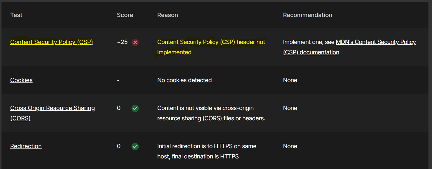 우선 -25점이나 가져간 친구는 CSP 부분입니다. 콘텐츠 보안 정책에 대한 헤더를 설정하지 않았으니, MDN CSP 문서 참고해서 하나 장만하라고 하는 군요.