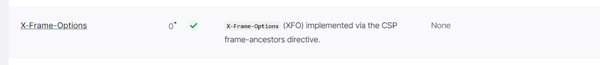 변경된 부분은 X-Frame-Options 이었습니다. 해당 부분도 -25 점수를 보였기 때문이었는데, 문제가 개선되면서 점수가 올라간 것입니다. 해당 문제가 개선된 이유는 추가한 옵션 중 frame-ancestors 'none'; 이 추가 되었기 때문입니다.