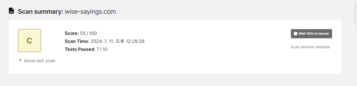 검사 결과 중에서 CSP 항목이 기존(2024.07.10) -25 에서 5 점이 빠진 -20 이 되었습니다. 옆에는 5점만 개선된 이유와 높이려면 어떻게 해야하는지 권장사항이 나와있습니다. 이 외에도 실제 검사 후 CSP 부분 말고도 보안과 관련한 다양한 측정 항목들을 확인할 수 있으니 꼭 확인해보시길 추천드립니다.