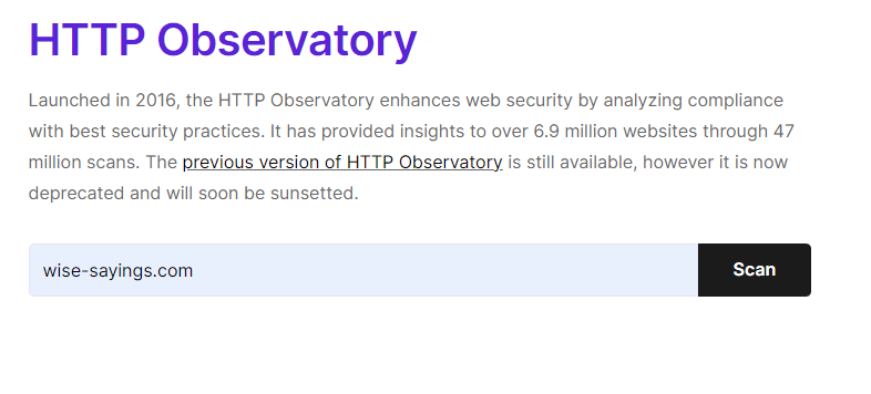 아래 사이트( https://developer.mozilla.org/en-US/observatory)로 접속 후 본인의 도메인 주소를 입력하고 Scan을 눌러 줍니다.