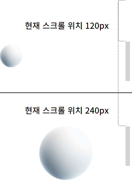 예를 들어, 뷰포트 최상단의 0px 지점에서 스크롤의 윗면 까지 거리가 120px 될 때 까지는 아무런 변화가 없다가, 240px 가 되는 지점에 원형의 요소의 크기를 확대하고, 중앙에 오도록 동작을 정의할 수 있습니다.