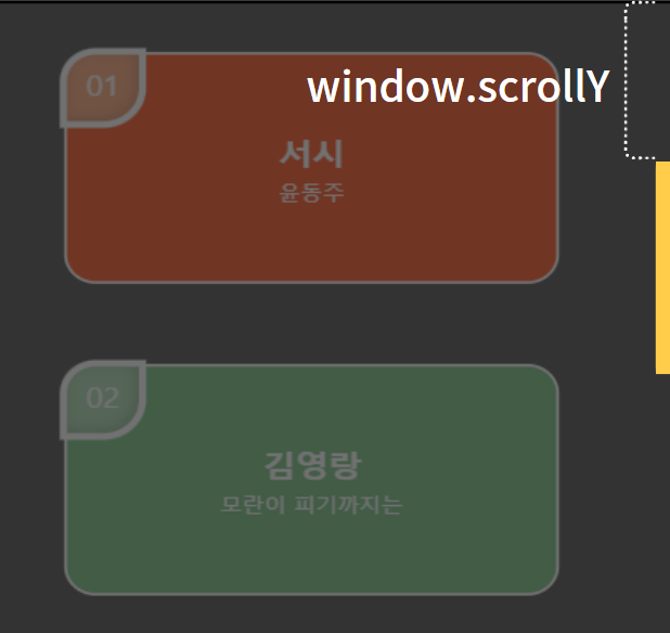 scrollY 변수는 브라우저 뷰포트 높이의 0vh 지점 부터 시작하여 스크롤의 윗면 까지의 거리를 px 단위로 저장하는 변수입니다. 이는 동적으로 매번 이벤트가 호출될 때 마다 변경된 값이 scrollY 에 담기게 됩니다. 즉, 현재 스크롤이 어느 위치에 도달하였는지를 추적할 수 있도록 해줍니다.