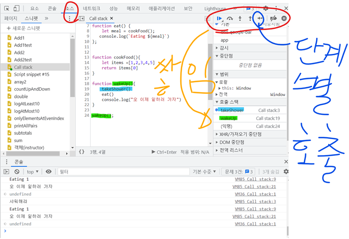 | 예외적으로 자바스크립트는 비동기적 작업을 수행할 수 있는데, 만일 오래 걸리는 코드(setTimeout 등의 비동기적 함수)가 있다면 이를 웹 API에서 처리 후 콜백 큐에서 대기하고 있다가 이전에 먼저 실행된 코드가 완료될 때 까지 기다렸다가 호출 스택으로 다시 돌아와서 마저 실행된다. |