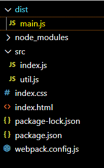 - 앞서 명명한 빌드 명령어를 입력하여 실행하면 webpack.config.js 의 output 속성에 지정한 path 경로의 dist 폴더가 생성된 것을 확인할 수 있다.