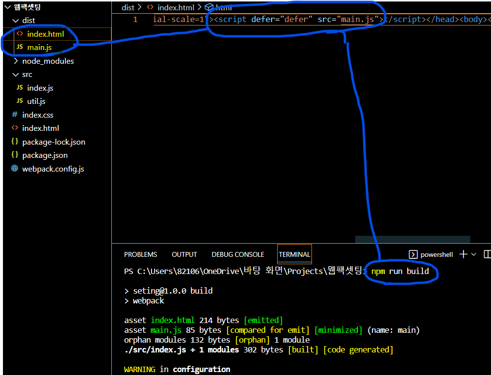 다시 [터미널] 에 npm run build 하여 웹팩을 실행하면 dist 폴더에 main.js 가 스크립트된 index.html 파일이 생성된 것을 볼 수 있다.