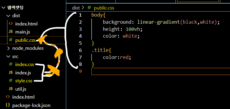 이렇게 설정하고 다시 webpack 을 실행하면 지정한 이름으로 css 파일이 dist 폴더에 생성되었다.