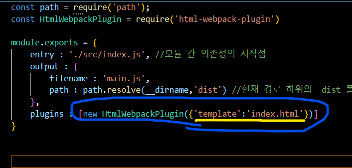 그렇다. 이대로만 한다면 기존에 작성한 html 파일이 아니라 새로 생성된 html 이 설정된다. 따라서 이러한 문제를 해결하기 위해 webpack.config.js 의 plugins : [new HTMLWebpackPlugin( 인자 )] 에서 ( ) 요 안에 인자 값으로 { template : 'index.html' } 을 넣어주면, 우리가 작성해온 html 파일의 내용을 참조하여 번들된 파일과 이어주는 HTML 파일을 생성해준다.